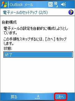 「電子メールのセットアップ(2/5)」が表示されますので、状態が「終了」になりましたら、「次へ」をタップします。