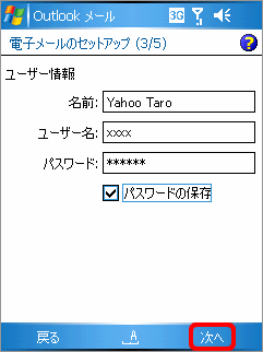 「電子メールのセットアップ(3/5)」が表示されますのでユーザー情報を入力し、「次へ」ボタンをタップします。