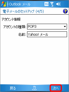 「電子メールのセットアップ(4/5)」が表示されますのでアカウント情報を入力し「次へ」をタップします。