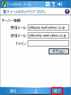 「電子メールのセットアップ(5/5)」が表示されますので、サーバー情報を入力し「完了」をタップします。