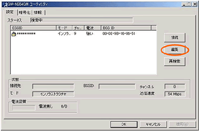 「スタート」メニュー→「プログラム」→「BROAD LANNER WAVE」→「PLANEX GW-NS54GM ユーティリティ」を選択します。