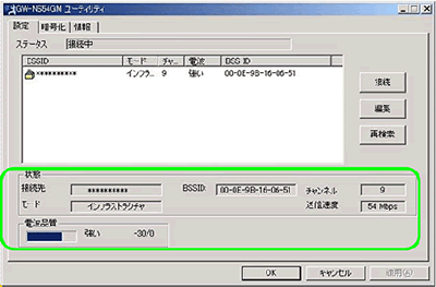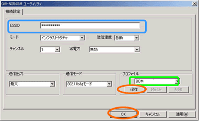 接続設定項目の「ESSID」にBBモバイルポイントのSSIDを入力してください。設定を反映するためにプロファイルとして保存します。必要なプロファイル名(ここではBBM)を入力し、「保存」をクリックします。保存後、「OK」をクリックしてください。- BBモバイルポイントのSSID、WEPキーはお申し込み時にご案内いたします。