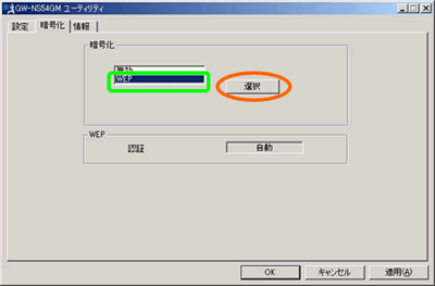 メニューの「暗号化」を選択して、暗号化の方式は「WEP」を選びます。WEPキー入力画面に入るため「選択」をクリックします。 -