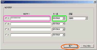 「キー長」が「40/64bit」であることを確認し、BBモバイルポイントの「WEPキー」を入力してください。入力が終了したら「完了」をクリックします。 -
