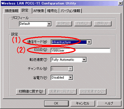 通信モード(M)」が「Infrastructure」(初期設定)となっていることを確認し(1)、「ESSID(S)」に「YBBUser」か「BBUser」(初期設定)もしくはお客様が設定されたESSIDが表示されていることを確認します(2)。