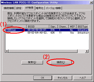 リストの中から、お客様のESSID「YBBUser」(初期設定)もしくはご自身で設定されたESSIDを選択し(1)、「接続(C)」をクリックします(2)。