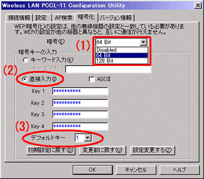「直接入力(I)」にチェックを入れ(2)、Key1の欄にWEPキーを入力してください。