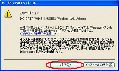 「ロゴテストに合格していません」と続行の確認画面が表示されますが、「続行(C)」をクリックしてください(アイ・オー・データ機器社にて動作検証済みです)。