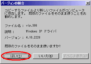 インストールの途中で以下のような画面が表示され、OSのディスクを要求される場合があります。 その際は、お客様がお持ちのWindows 98/98SE/MeのCD-ROMをCD-ROMドライブに挿入してから、画面の「OK」をクリックします。