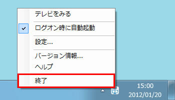 タスクトレイに表示されている、地デジViewerのアイコンを右クリックして、[終了]を選択します。 -