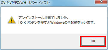 アンインストール完了のメッセージが表示されますので、[OK]を選択します。パソコンが再起動します。