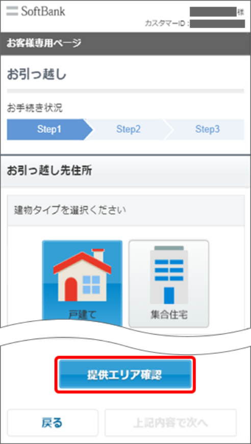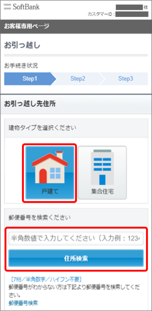 お引っ越し先の建物タイプを「戸建て」か「集合住宅」かいずれかタップし、「郵便番号」を入力後「住所検索」をタップ