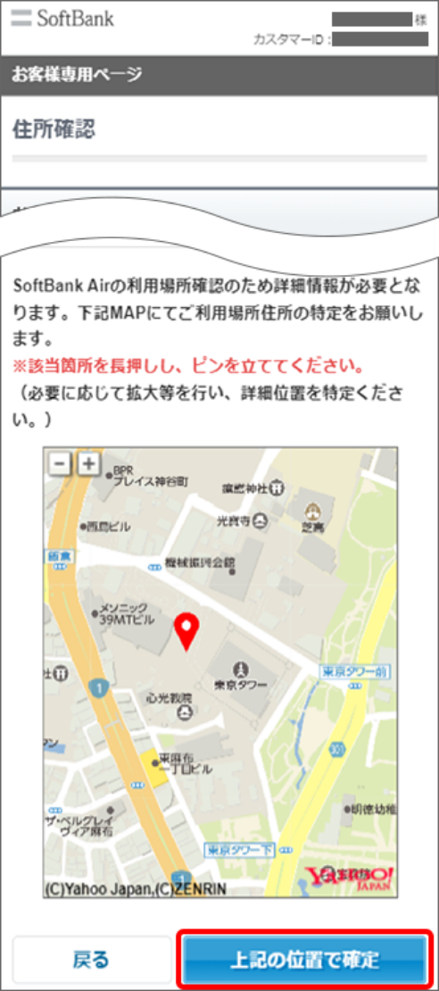 マップからお客さまの「設置場所住所」を探し、「場所をタップ」→「長押し」→「ピンを立てる」
