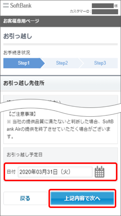 (カレンダー)」をタップし、「お引っ越し予定日」を設定後「上記内容で次へ」をタップ