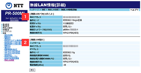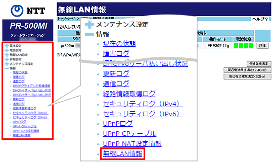 IEEE802.11n/a互換 : IEEE802.11n/IEEE802.11a互換モードで動作しています。使用チャネル 現在使用中のチャネルです。 拡張チャネル 現在使用中の拡張チャネルです。 - 無線LAN(N)をご利用の方のみ
