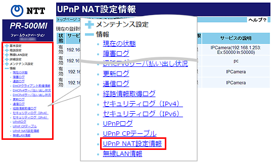 [情報]をクリックして、[UPnP NAT設定情報]をクリックします。