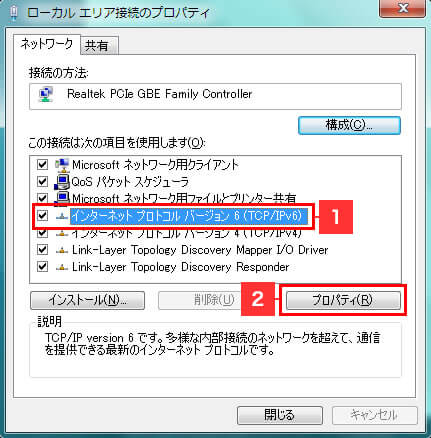 - (1)[インターネット プロトコル バージョン 6 (TCP/IPv6)]を選択します。