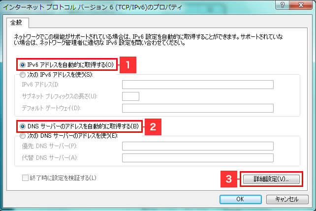 - (1)[IPv6 アドレスを自動的に取得する]と