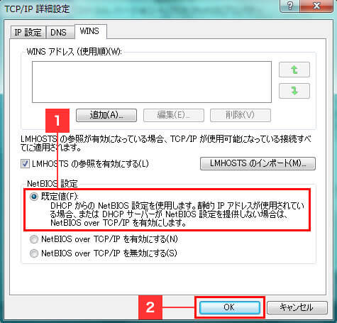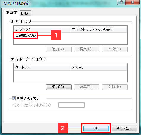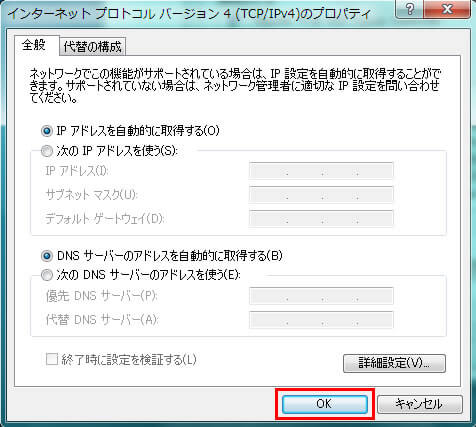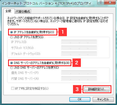 - (2)[DNS サーバーのアドレスを自動的に取得する]を選択し、