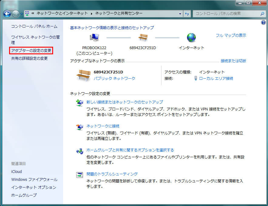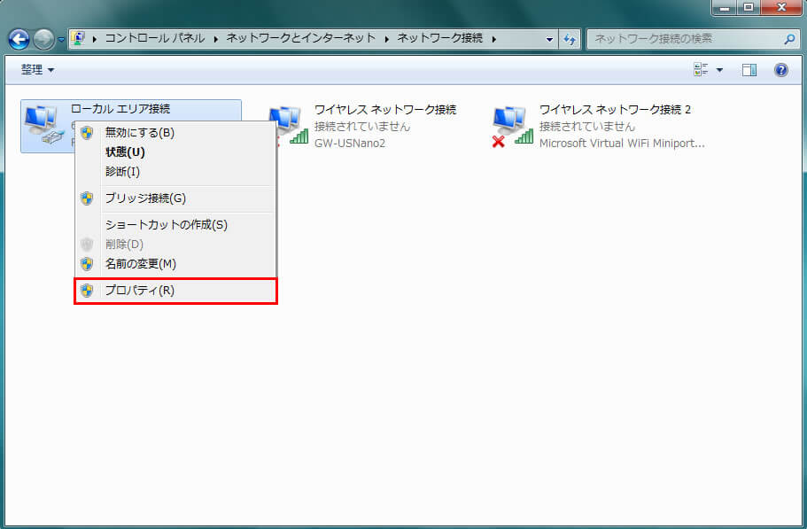 ローカルエリア接続を右クリックして[プロパティ]を選択します。