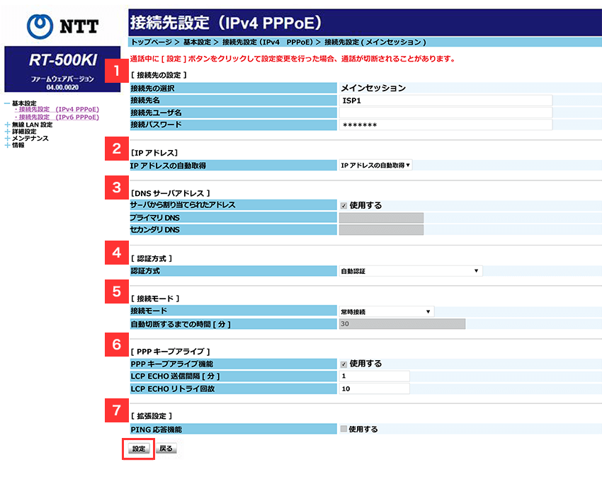 [基本設定]をクリックして、[接続先設定(IPv4 PPPoE)]を選択した後、[メインセッション]にチェックを入れます。