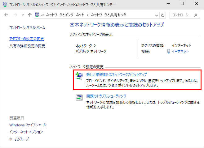 [新しい接続またはネットワークのセットアップ]を選択します。