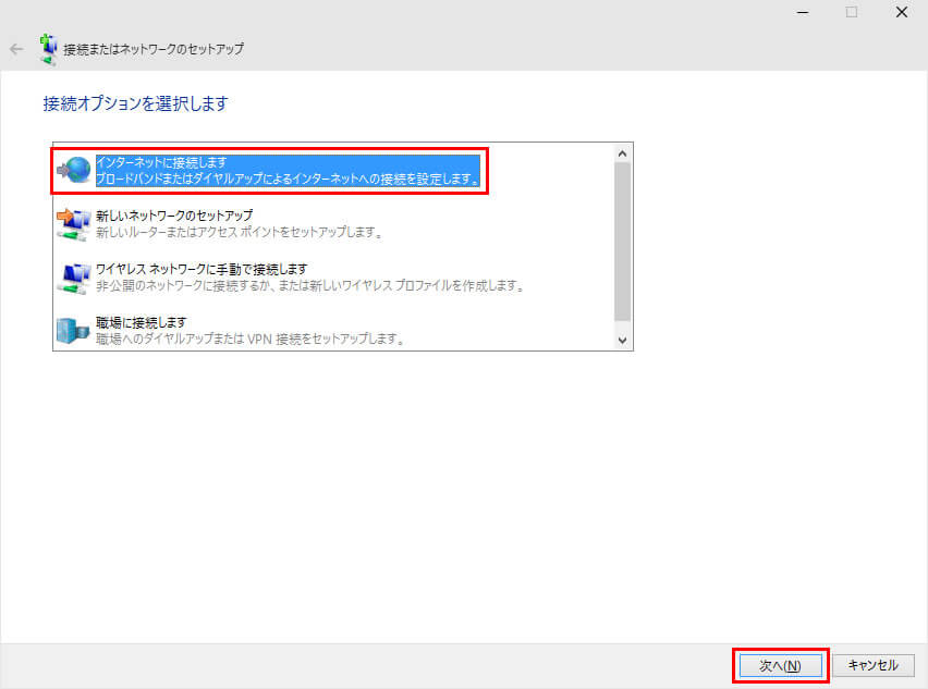 [インターネットに接続します]を選択し、[次へ]を選択します。