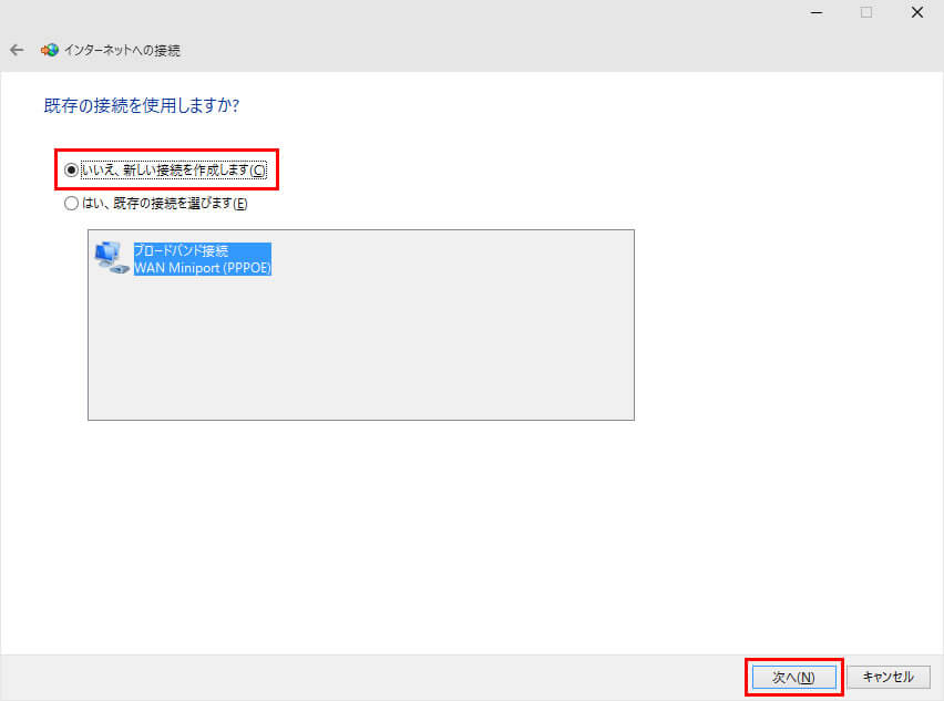[新しい接続をセットアップします]を選択すると、下記画面が表示されます。[既存の接続を使用しますか?]と表示された場合