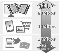 たとえば、メールやWEBページの閲覧程度であればさほど速度は必要ありませんが、高画質・高音質な動画の場合はより速い速度が必要です。