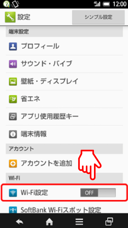 「Wi-Fi」を指で軽く叩いてください(タップ)。