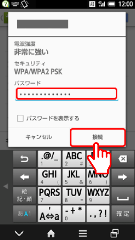 4で確認した暗号キー(PSK-AES)をパスワード欄に入力して「接続」を軽く叩いてください(タップ)。