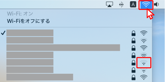 チェックマークの付いているSSIDのWi-Fiマークが濃い扇型の線が3本のときは、電波が強いです。