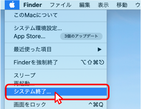 リンゴマークをクリックし、表示された「システム終了」をクリックします。