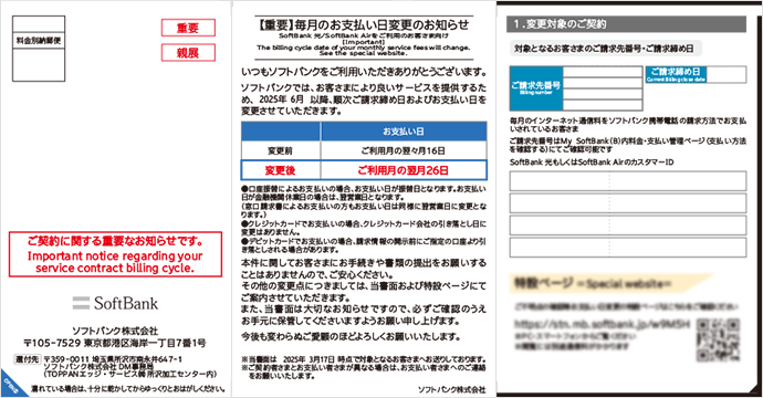 ソフトバンクではよりよいサービスを提供するため、合算請求をお申込みいただいているモバイルサービス(すでにご解約されている場合を含みます)のお支払い日を順次変更させていただきます。