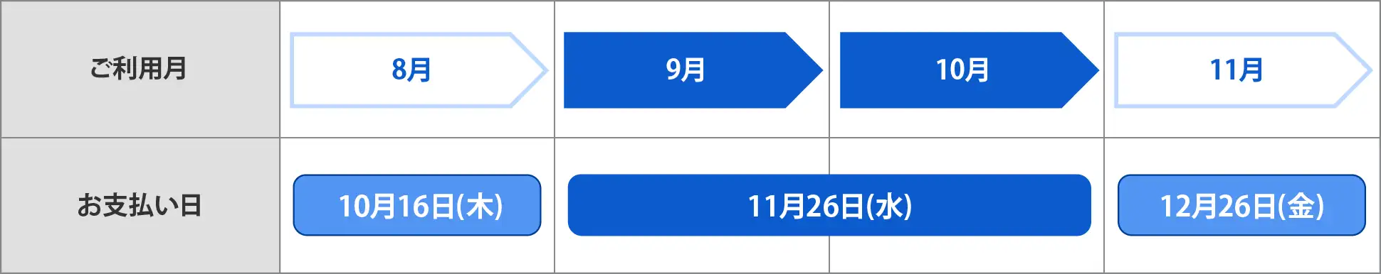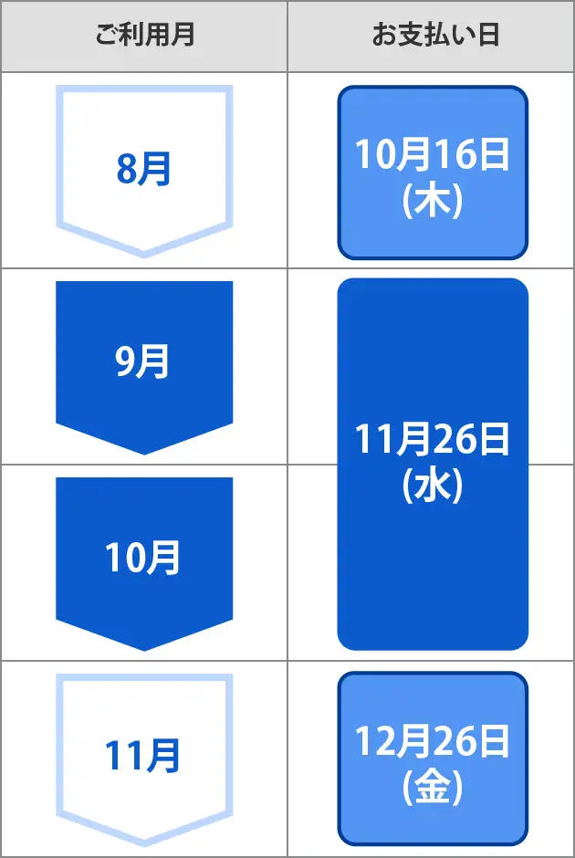 - クレジットカードでお支払いの場合、お支払い日はクレジットカード会社の指定日となります。ご利用のクレジットカードによってはカードの引き落とし日の変更や、 変更前後のご利用料金の引き落とし日が重複する場合があります。
