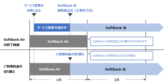 A. ご契約およびご利用料金の切り替えタイミングは「SoftBank 光」の工事完了日によって異なります。