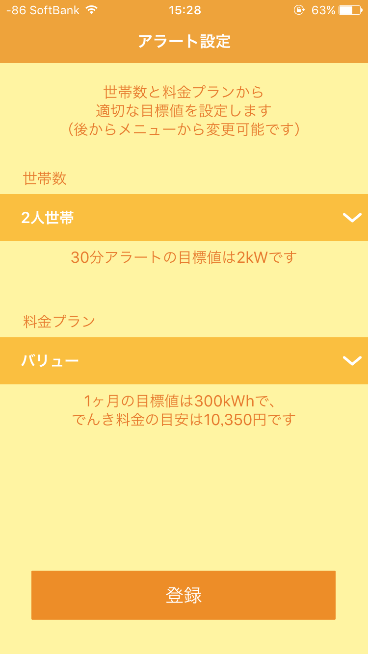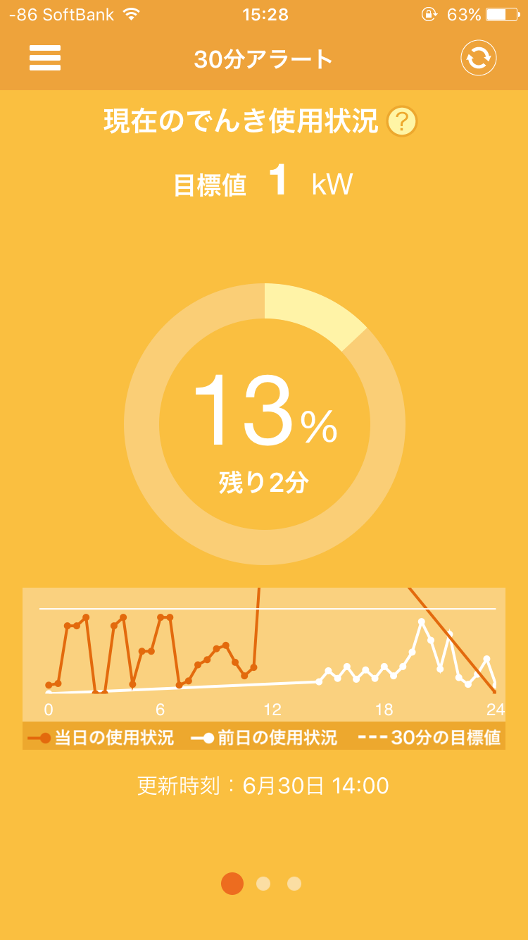 リアルタイムにでんきの使用状況を表示し、目標値に近づくと節電アラートが表示されます。