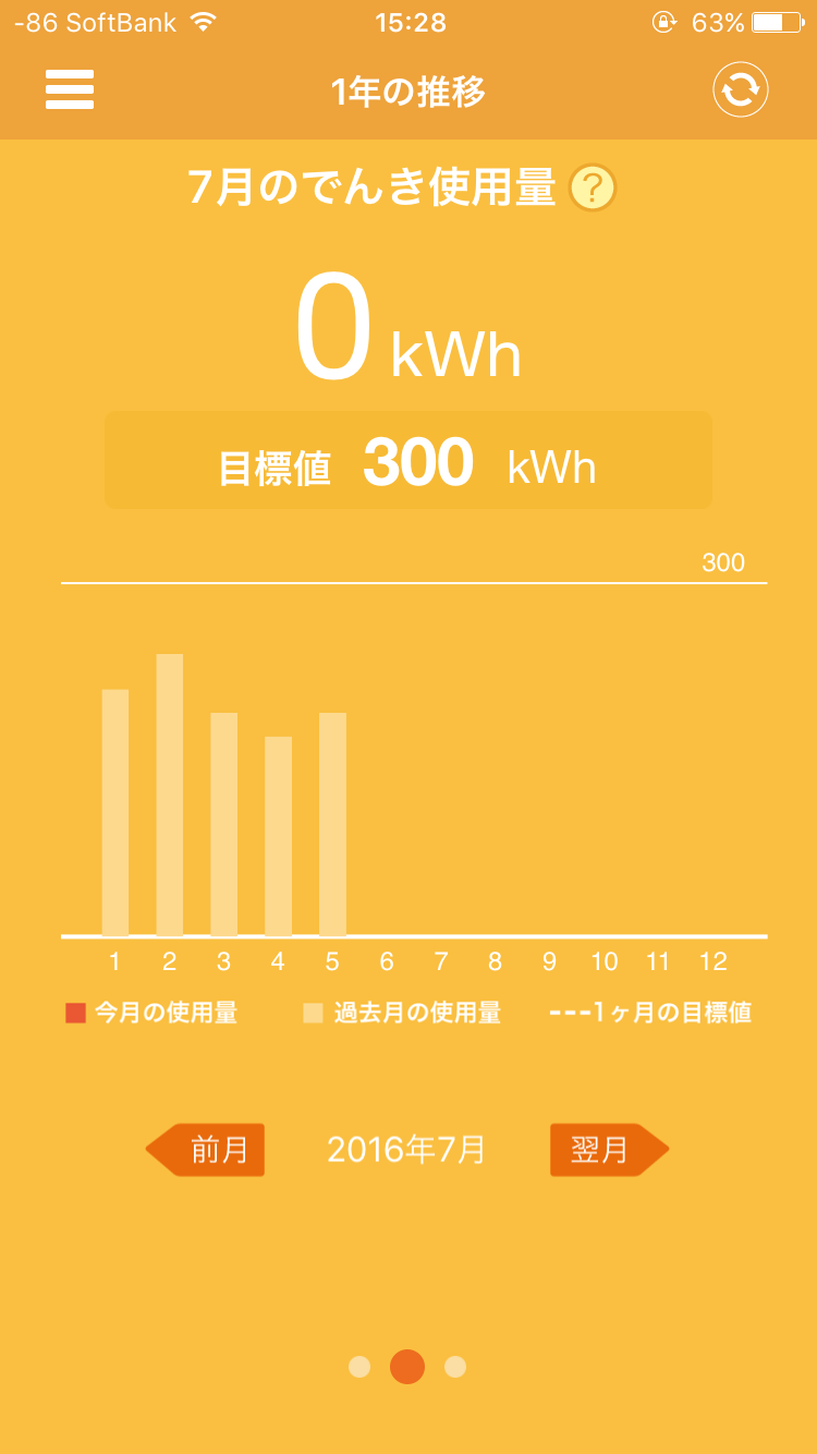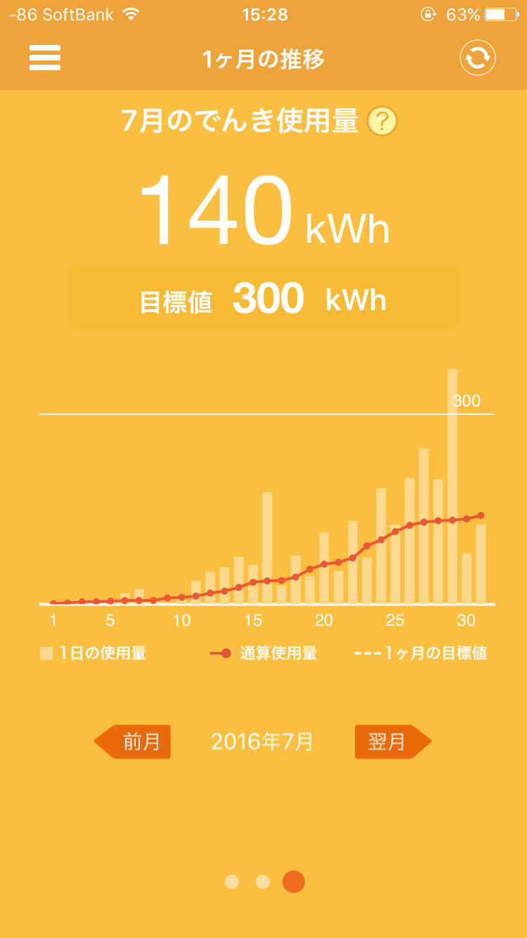 1ヵ月のでんき使用量の推移が見れます。前月、翌月で月の変更が可能です。