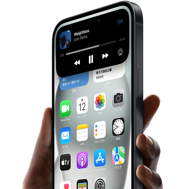 - ディスプレイのサイズ:ディスプレイは美しい曲線を描くように四隅に丸みを持たせてデザインされており、標準的な長方形に収まります。 標準的な長方形として対角線の長さを測った場合のスクリーンのサイズは6.12インチ(iPhone 15 Pro、iPhone 15)または6.69インチ(iPhone 15 Pro Max、iPhone 15 Plus)です。 実際の表示領域はこれより小さくなります。