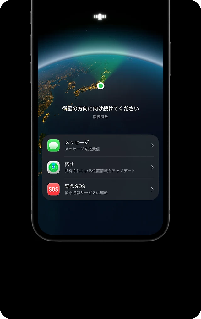 - 衛星経由の緊急SOSとメッセージ: iPhone 14 以降のすべてのモデルで、アクティベーション後2年間は衛星通信機能を無料で利用できます。 接続と応答にかかる時間は場所、現地の状況、その他の要因によって変わります。 一部の衛星通信機能を利用するには、通信事業者の契約プランが必要です。 衛星経由のSMSメッセージは対応する通信事業者で利用できます。 SMSメッセージの通信料がかかる場合があります。衛星通信接続はGlobalstarとその関連会社が提供しています。 詳しくはsupport.apple.com/ja-jp/105097をご覧ください。