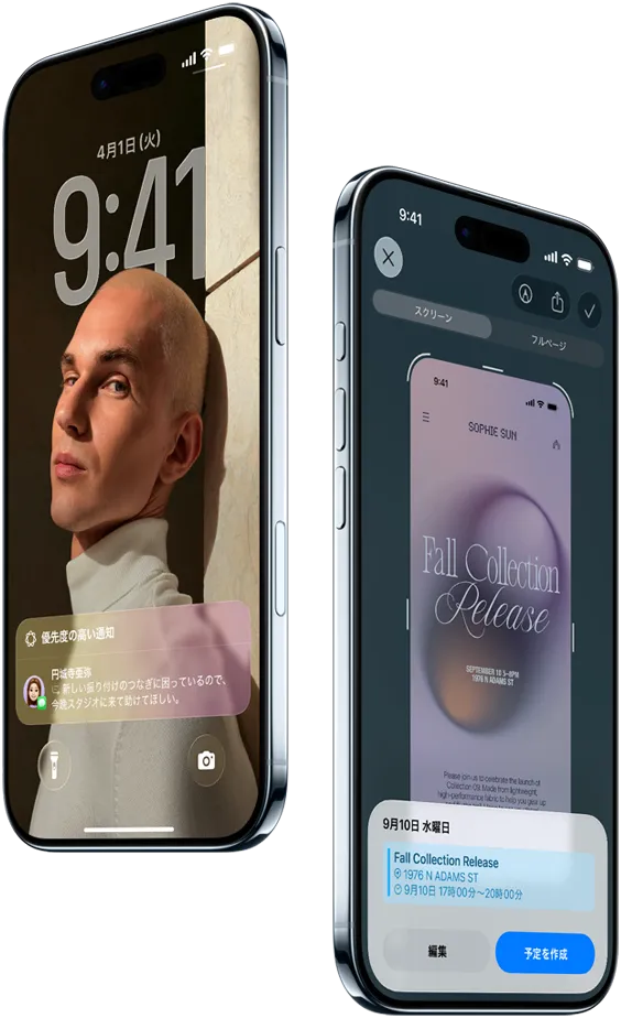 • ビジュアルインテリジェンス:ビジュアルインテリジェンスは、Apple Intelligenceを有効にしたすべての iPhone で利用できます。 言語や地域によっては一部の機能を利用できない場合があります。 詳しくはsupport.apple.com/ja-jp/121115#visual-intelligenceをご覧ください。
