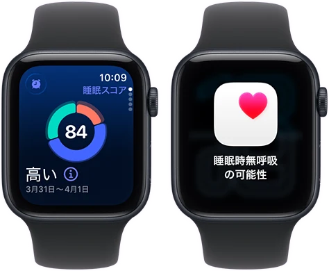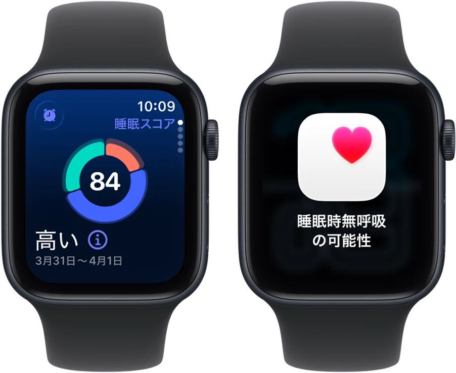- 睡眠時無呼吸の通知:睡眠時無呼吸の通知機能は Apple Watch Series 9 以降、Apple Watch Ultra 2 以降、および Apple Watch SE 3 で利用できます。この機能は、睡眠時無呼吸と診断されたことがない18歳以上の方による使用を目的とし、中等度から重度の睡眠時無呼吸を示唆する兆候を検出します。販売名:Appleの睡眠時無呼吸の兆候の通知プログラム。管理医療機器販売業者等:Apple Japan合同会社(東京都港区六本木6丁目10番1号六本木ヒルズ 0120-277-535)