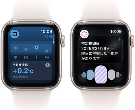 - 皮膚温センサー:皮膚温センサー機能は医療での使用を目的とするものではありません。皮膚温センサーは、Apple Watch Series 8 以降とすべての Apple Watch Ultra モデルでのみ利用できます。