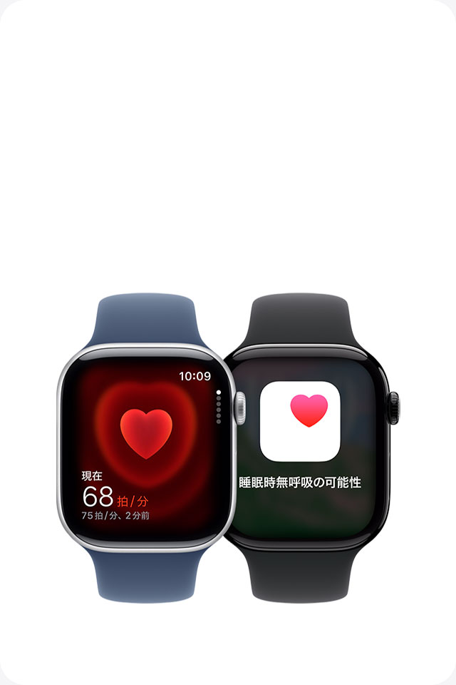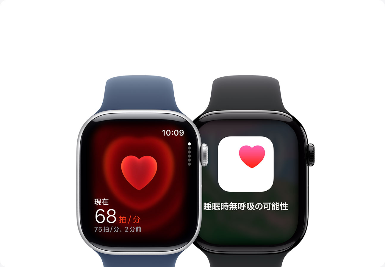 - 睡眠時無呼吸の通知:睡眠時無呼吸の通知機能は Apple Watch Series 9 以降および Apple Watch Ultra 2 で利用できます。 この機能は、睡眠時無呼吸と診断されたことがない18歳以上の方による使用を目的とし、中等度から重度の睡眠時無呼吸を示唆する兆候を検出します。 販売名:Appleの睡眠時無呼吸の兆候の通知プログラム。 管理医療機器販売業者等:Apple Japan合同会社(東京都港区六本木6丁目10番1号六本木ヒルズ 0120-277-535)