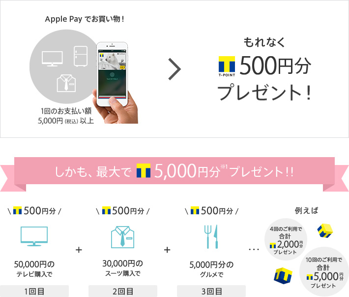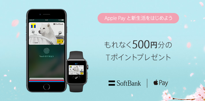 期間中、ソフトバンクカードを追加した Apple Pay で1回のお支払額5,000円(税込)以上のお買い物で、もれなく500円分のTポイントをプレゼントいたします。