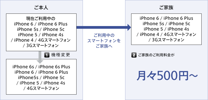 ![ご本人 現在ご利用中の iPhone 6 / iPhone 6 Plus / iPhone 5s / iPhone 5c / iPhone 5 / iPhone 4s / iPhone 4 / 4Gスマートフォン / 3Gスマートフォン ↓[1]機種変更 iPhone 6s / iPhone 6s Plus / iPhone 6 / iPhone 6 Plus / iPhone 5s / iPhone 5c / iPhone 5 / iPhone 4s / 4Gスマートフォン → ご利用中のスマートフォンをご家族へ → ご家族 iPhone 6 / iPhone 6 Plus / iPhone 5s / iPhone 5c / iPhone 5 / iPhone 4s / iPhone 4 / 4Gスマートフォン / 3Gスマートフォン [2]ご家族のご利用料金が 月々500円~](/mobile/set/data/campaigns/list/family/img/fig_campaign.png)