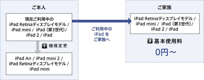 - すでにご利用中のご家族回線を本キャンペーン対象機種へ機種変更し、それまで利用していた iPad Retinaディスプレイモデル / iPad mini / iPad (第3世代)/ iPad 2 / iPad を新たにご家族回線としてご利用いただけます。