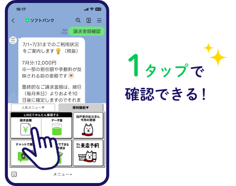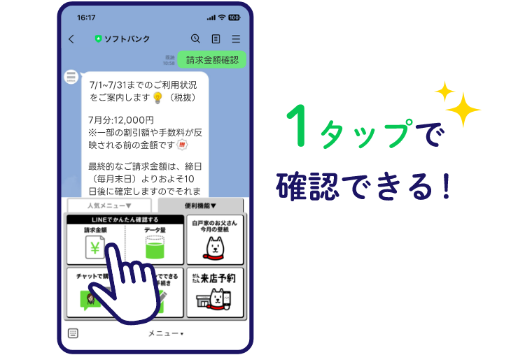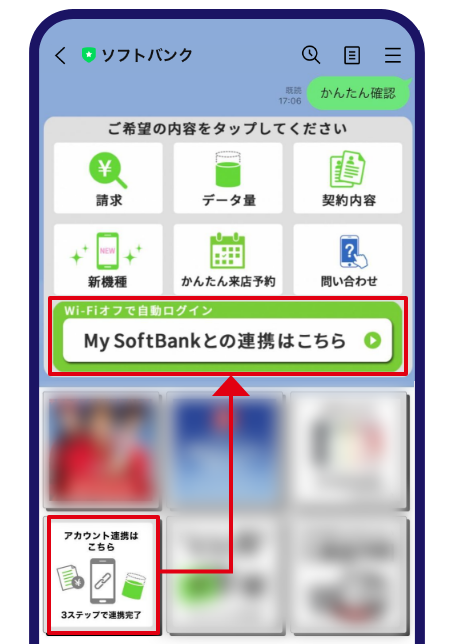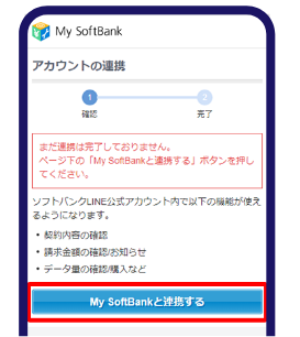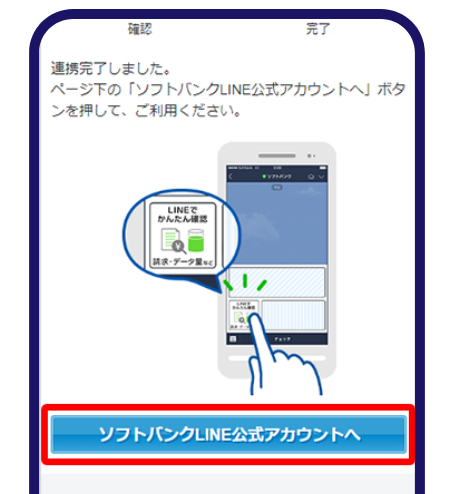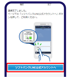 こちらでMy SoftBankとの連携は完了です。画面下の「ソフトバンクLINE公式アカウントへ」をタップし、LINEトーク画面よりご希望のメニューをご利用ください。