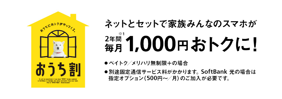 - SoftBank 光 ファミリー・ライト以外の固定通信サービスでおうち割 光セットを適用中の場合、SoftBank 光 ファミリー・ライトへの変更に伴い、おうち割 光セット、おうち割 光セット(モバイルWi-Fiルーター特典)の割引額が下がる場合があります。