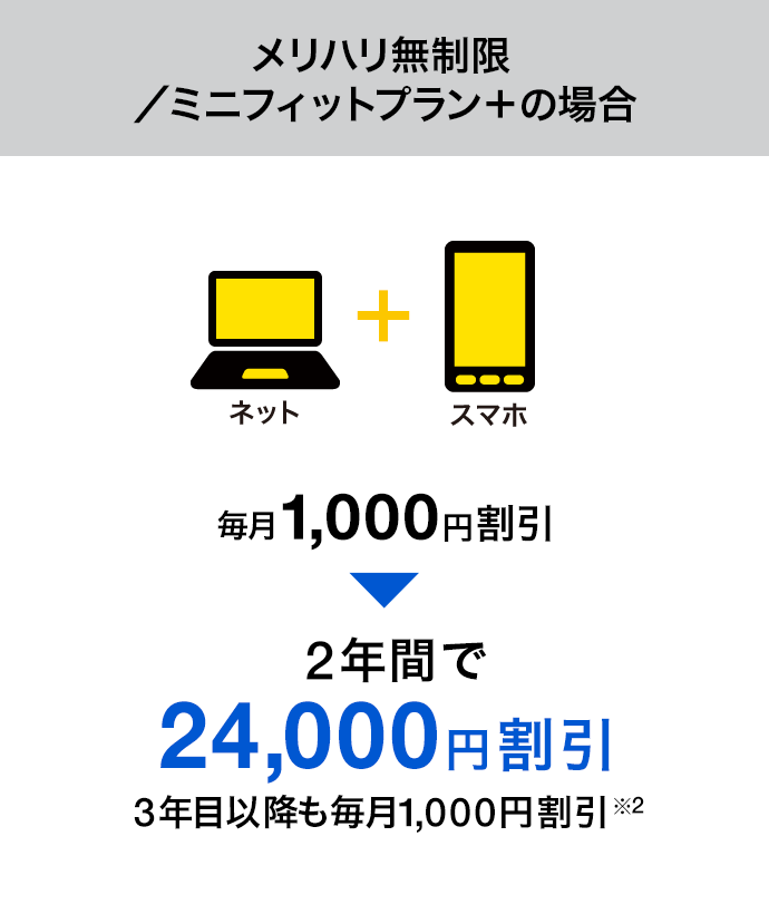 - ソフトバンク網を利用するMVNOの場合、割引対象外となります。